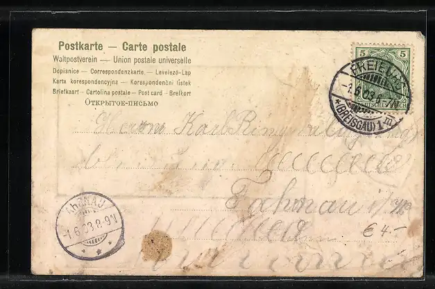 gelaufen 1903, minimaler Eckschaden li. oben, guter Zustand