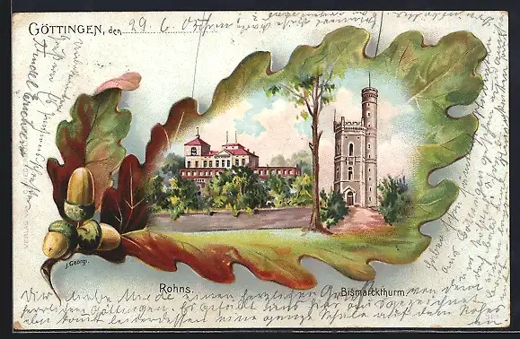 Passepartout-Lithographie Göttingen, Gasthaus Rohns, Bismarckturm, Eichenblatt