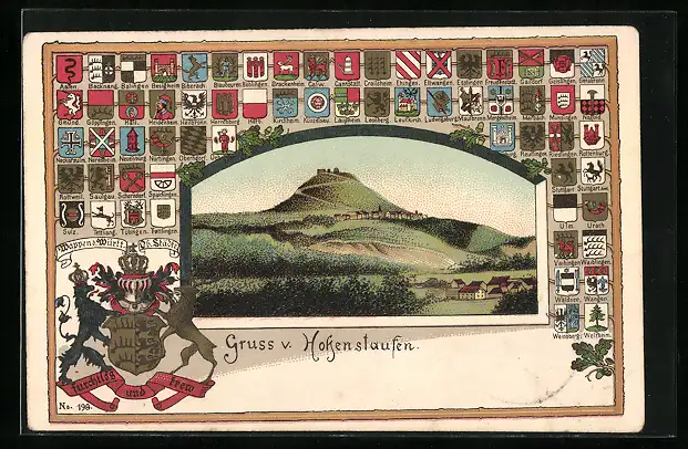 Passepartout-Lithographie Hohenstaufen, Ortspartie, Wappen von Brackenheim, Crailshaim & Ehingen
