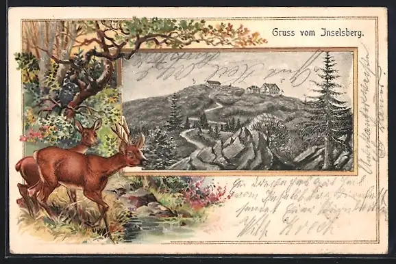Passepartout-Lithographie Inselsberg, Blick auf den Berg, Rehe