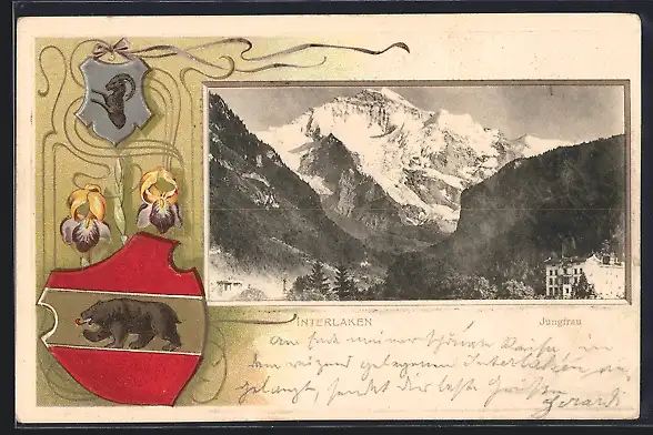 Passepartout-Lithographie Interlaken, Blick zur Jungfrau, Wappen