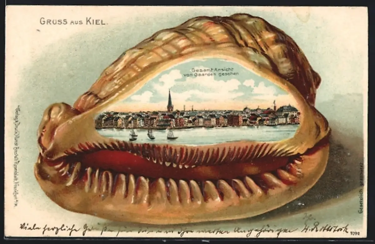 Passepartout-Lithographie Kiel, Gesamtansicht von Gaarden gesehen, Muschel