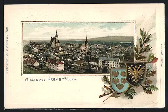 Passepartout-Lithographie Krems a.d. Donau, Ortsansicht, Stadtwappen