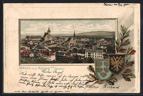 Passepartout-Lithographie Krems a.d. Donau, Ortsansicht, Wappen