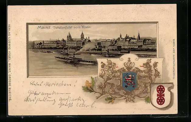 Passepartout-Lithographie Mainz, Dampfer auf dem Rhein, Blick auf die Stadt, Wappen