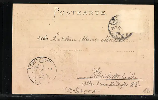Personenbezogene Daten auf der Rückseite der Karte wurden durch blauen Textmarker unkenntlich gemacht. Die blauen Stellen sind auf die Vorderseite durchgeweicht und wirken sich negativ auf das Postkartenfoto aus