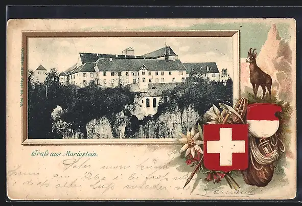 Passepartout-Lithographie Mariastein, Ortsansicht mit Wappen und Gämse