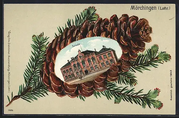 Passepartout-Lithographie Mörchingen, Schule in einem Tannenzapfen