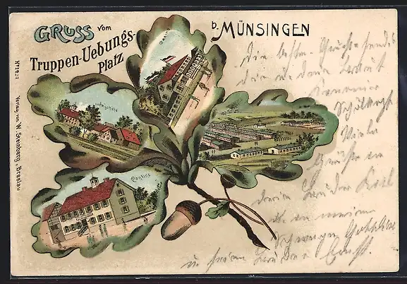 Passepartout-Lithographie Münsingen, Truppen-Uebungs-Platz, Ludwigshöhe, Casino u. Kantine im Eichenblatt