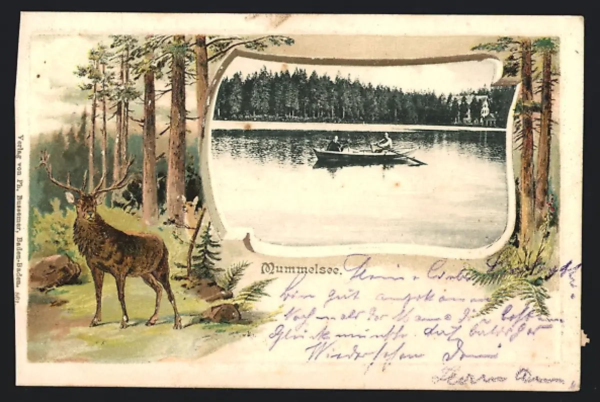 Passepartout-Lithographie Mummelsee, Panorama mit Boot, Hirsch im Wald