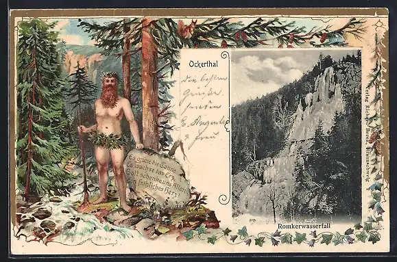 Passepartout-Lithographie Ockerthal, Romkerwasserfall im Passepartout mit wildem Mann