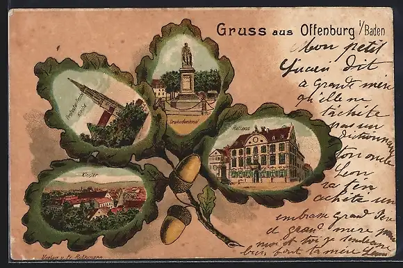 Passepartout-Lithographie Offenburg i. Baden, Ortsansicht mit Drakedenkmal und Rathaus