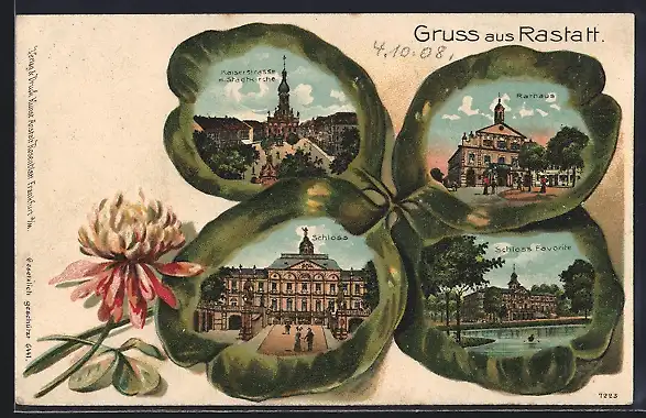 Passepartout-Lithographie Rastatt, Kaiserstrasse mit Stadtkirche, Schloss und Rathaus