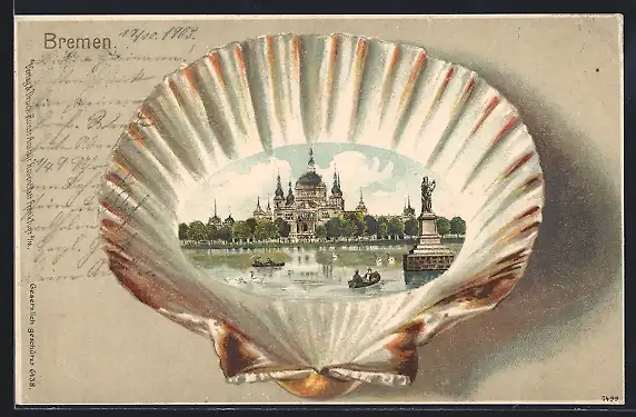 Passepartout-Lithographie Regensburg, Totalansicht vom Ort, Sicht durch die Muschel