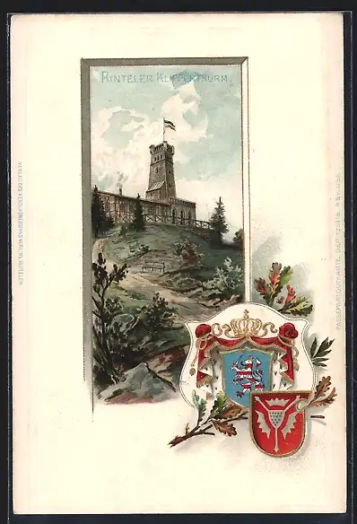 Passepartout-Lithographie Rinteln, Blick zum Klippenthurm, Wappen