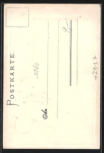 Personenbezogene Daten auf der Rückseite der Karte wurden durch blauen Textmarker unkenntlich gemacht. Die blauen Stellen sind auf die Vorderseite durchgeweicht und wirken sich negativ auf das Postkartenfoto aus