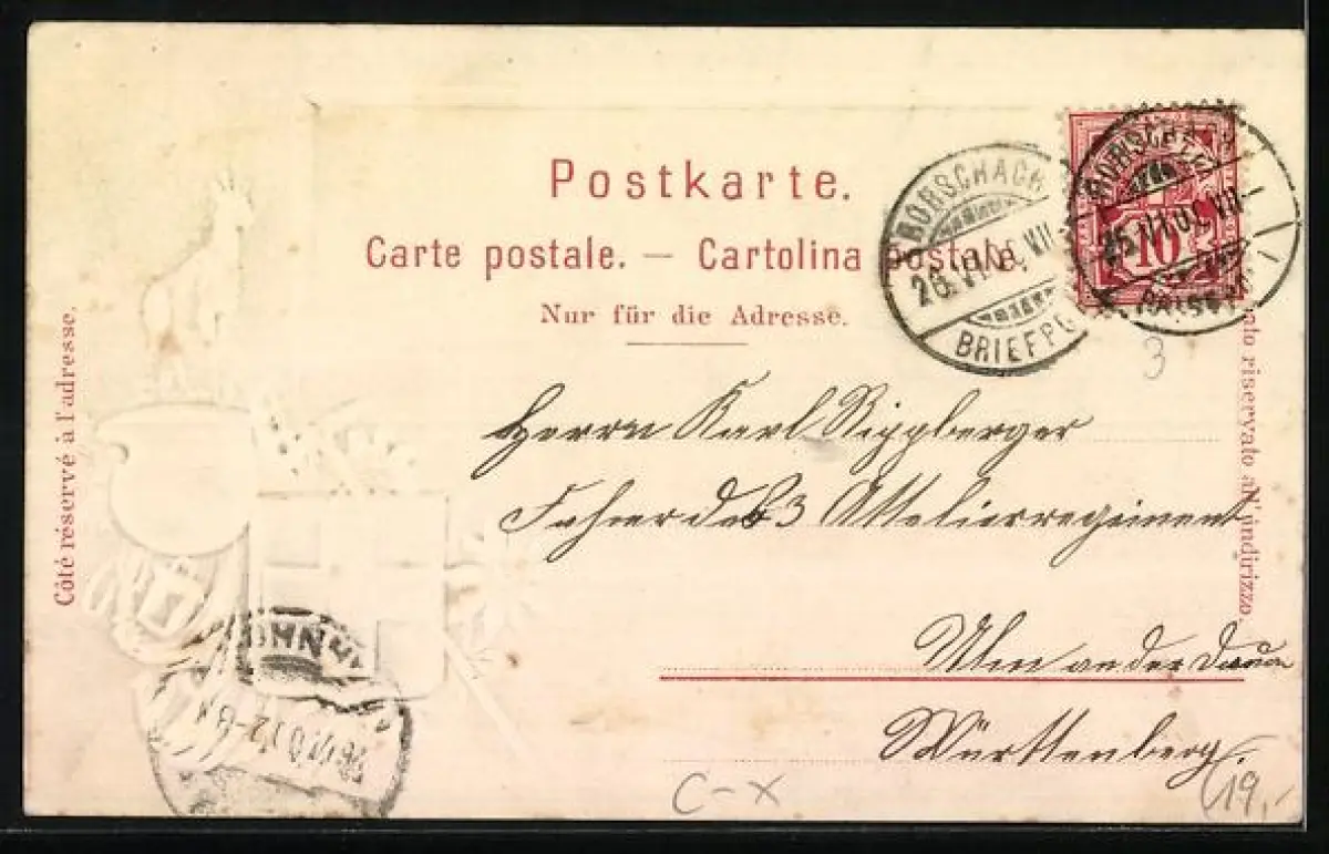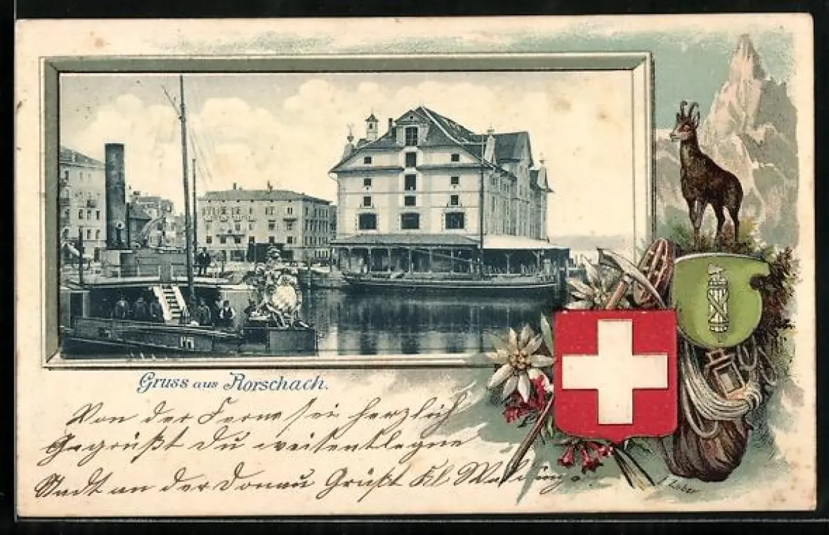 Passepartout-Lithographie Rorschach, Hafen, Wappen mit Gämse