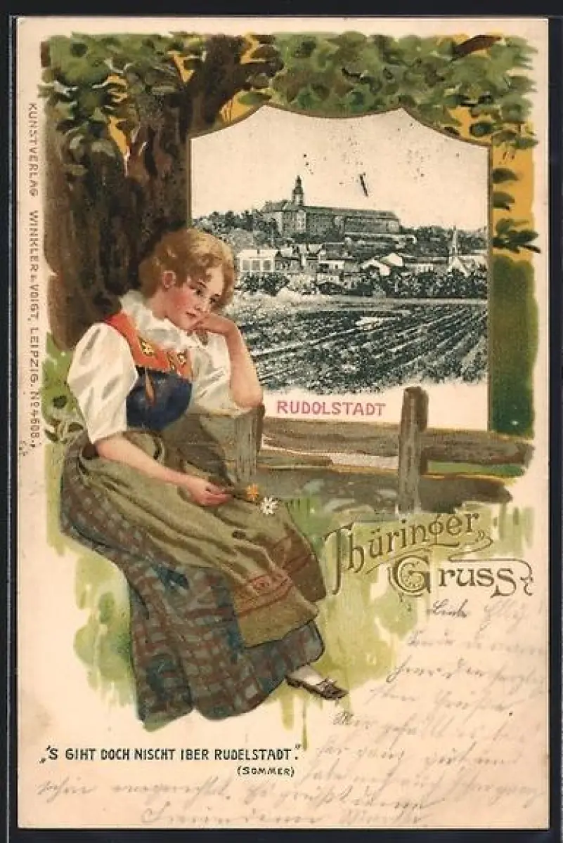 Passepartout-Lithographie Rudolstadt, Ortsansicht mit Kirche, Dame in Tracht