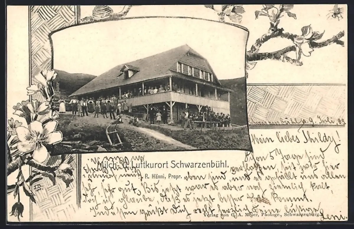 Passepartout-Lithographie Schwarzenbühl, Strassenpartie mit Gebäudeansicht