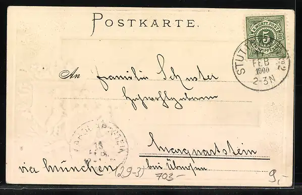 Personenbezogene Daten auf der Rückseite der Karte wurden durch blauen Textmarker unkenntlich gemacht. Die blauen Stellen sind auf die Vorderseite durchgeweicht und wirken sich negativ auf das Postkartenfoto aus