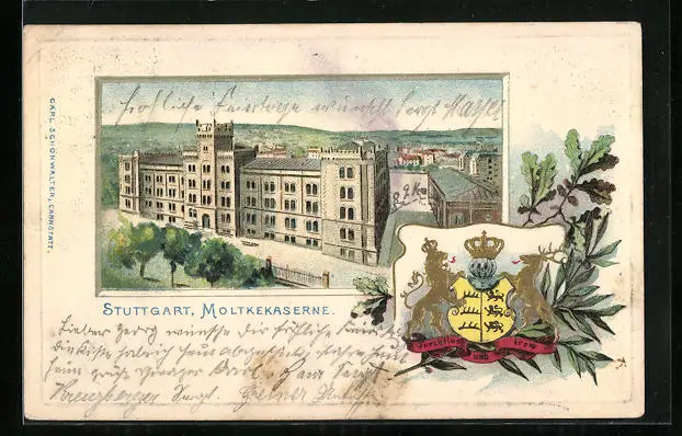 Passepartout-Lithographie Stuttgart, Moltkekaserne mit Wappen
