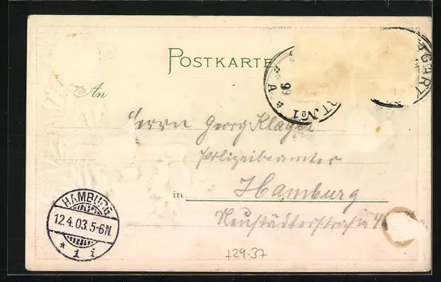 gelaufen 1903, Briefmarke entfernt, rückseitig Oberflächenschaden, Eckknick li. oben, guter Zustand