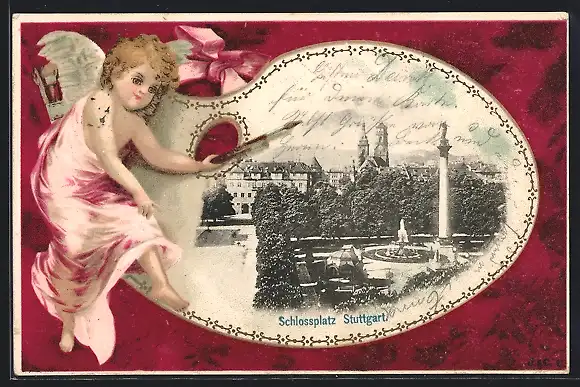 Passepartout-Lithographie Stuttgart, Schlossplatz, Engel mit Pinseln