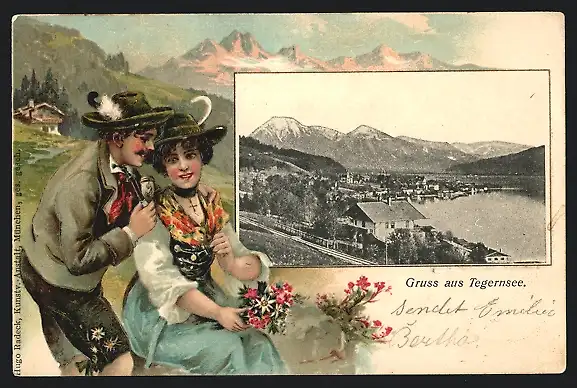 Passepartout-Lithographie Tegernsee, Ortsansicht und Paar in Trachten