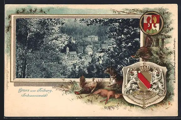 Passepartout-Lithographie Triberg, Ortsansicht von oben, Wappen, Jagdhund mit Beute