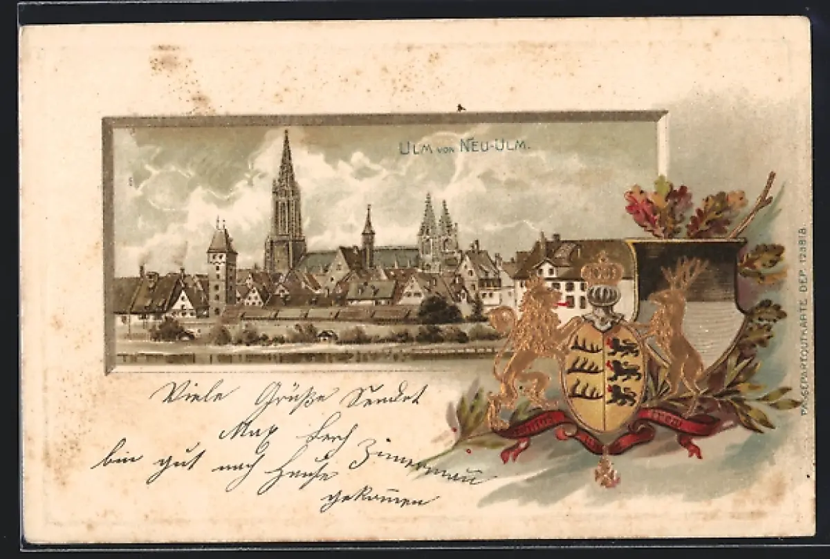 Passepartout-Lithographie Ulm / Donau, Panorama von Neu-Ulm, Wappen