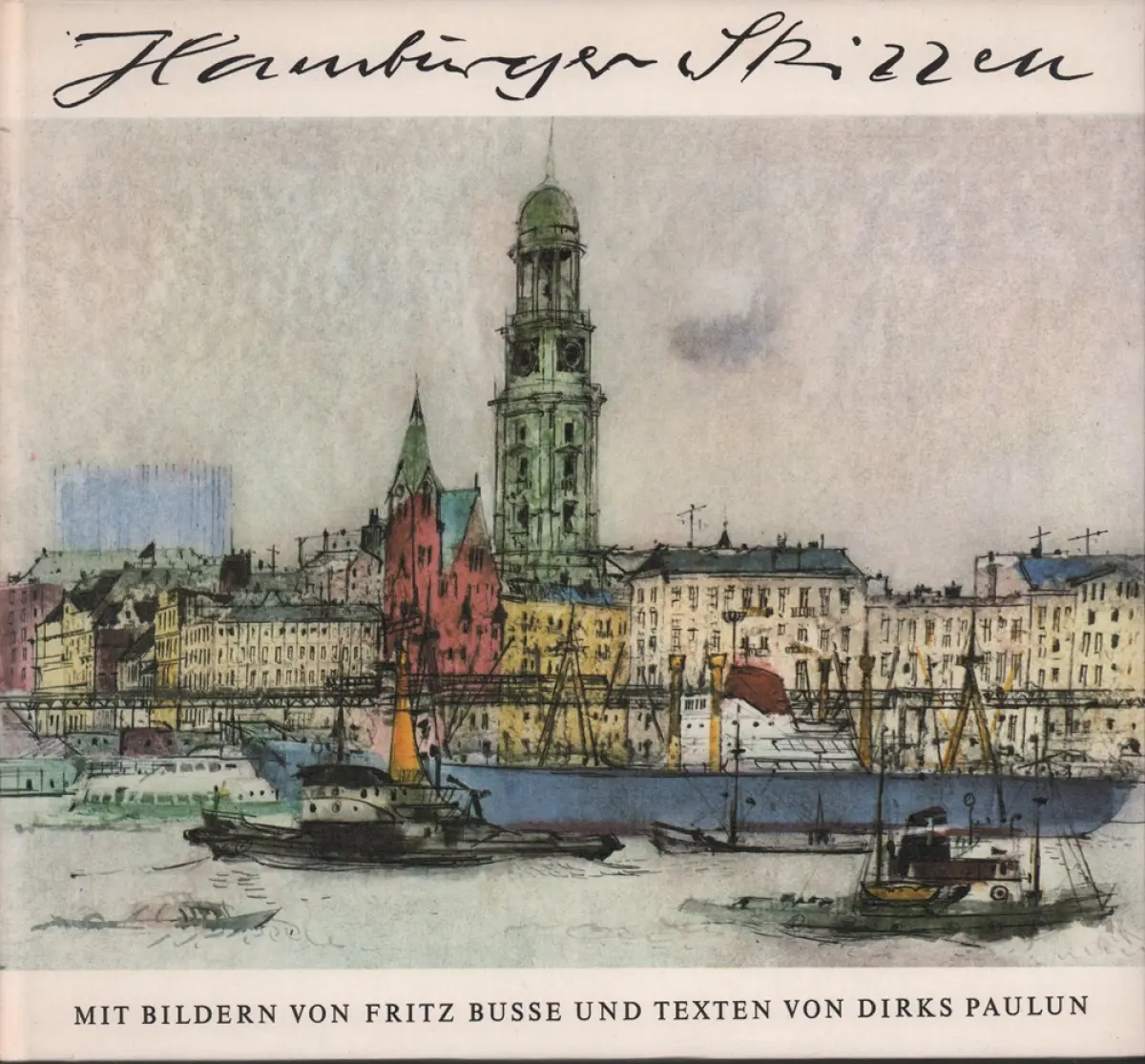 Außentitel: "Hamburger Skizzen. Mit Bildern von Fritz Busse und Texten von Dirks Paulun". - Bildlegenden dt./engl./franz. - Der 1903 in Österreich geb. Künstler Fritz Busse vertrat die Leichtigkeit, Luftigkeit u. Heiterkeit der Illustration der 1950er u. 1960er Jahre, die uns etwa in Mirko Szewczuks oder Raoul Dufys Arbeiten begegnen. Der ebenfalls 1903 (in Shanghai) geb. Dirks Paulun (gest. 1976) gründete mit Hans Harbeck u. Carl Bay das Kabarett "Wendeltreppe", zu dem später auch Heinz Erhardt stieß. Seine meist in Missingsch verfassten Gedichte, Kolumnen u. "Döntjes" brachten ihm den Beinamen "Eulenspiegel der Waterkant" bei. - Rücken leicht gebräunt, sonst gutes, sauberes Exemplar
