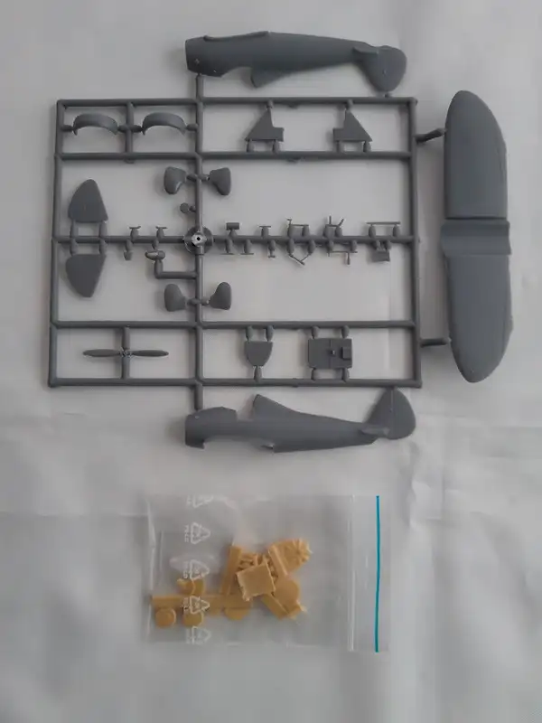 Einzelteile (Plastikbauteile) sind noch am Rahmen fixiert, Sichthülle wurde geöffnet.