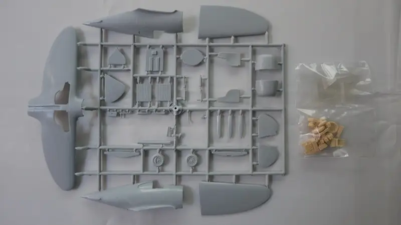 Einzelteile (Plastikbauteile) sind noch am Rahmen fixiert, Sichthülle wurde geöffnet.