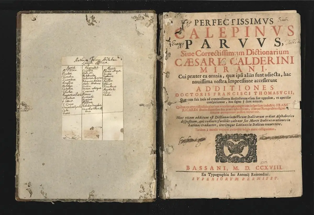 Bemerkungen: Stark überarbeitete und erweiterete Fassung des Latein-Wörterbuches des Amborgio Calepino (ca. 1440-1510), das erstmals 1502 erschienen war.