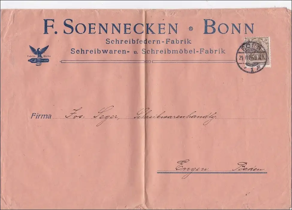 Perfin: Brief aus Bonn, F. Soennecken, 1906, Schreibfedern, FS