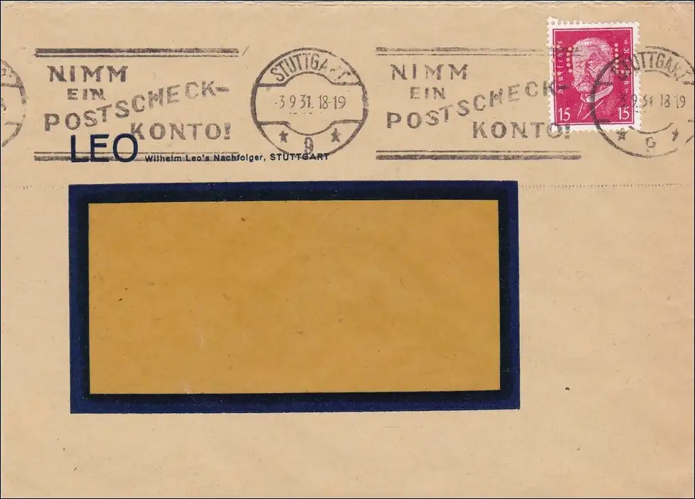 Perfin: Brief aus Stuttgart, Werbestempel, Postscheckkonto 1931, LEO