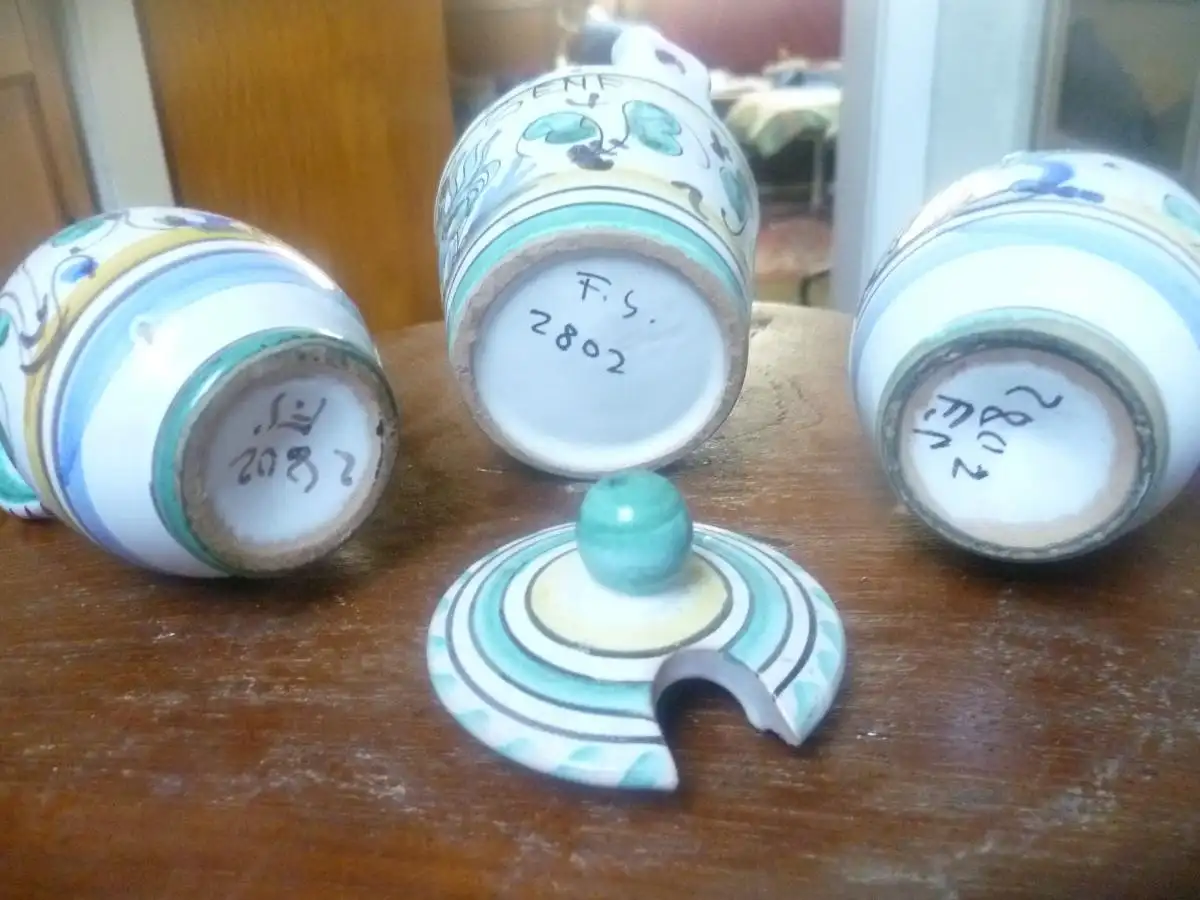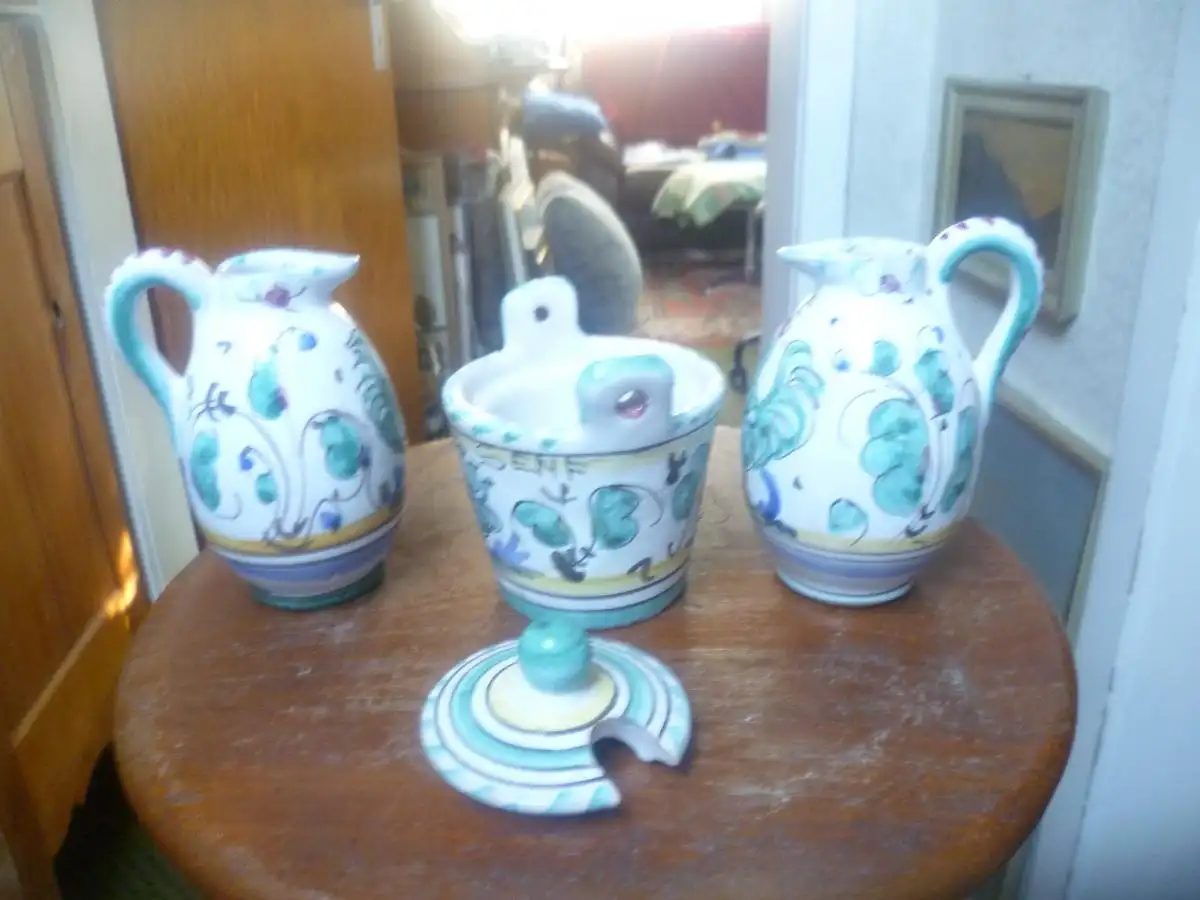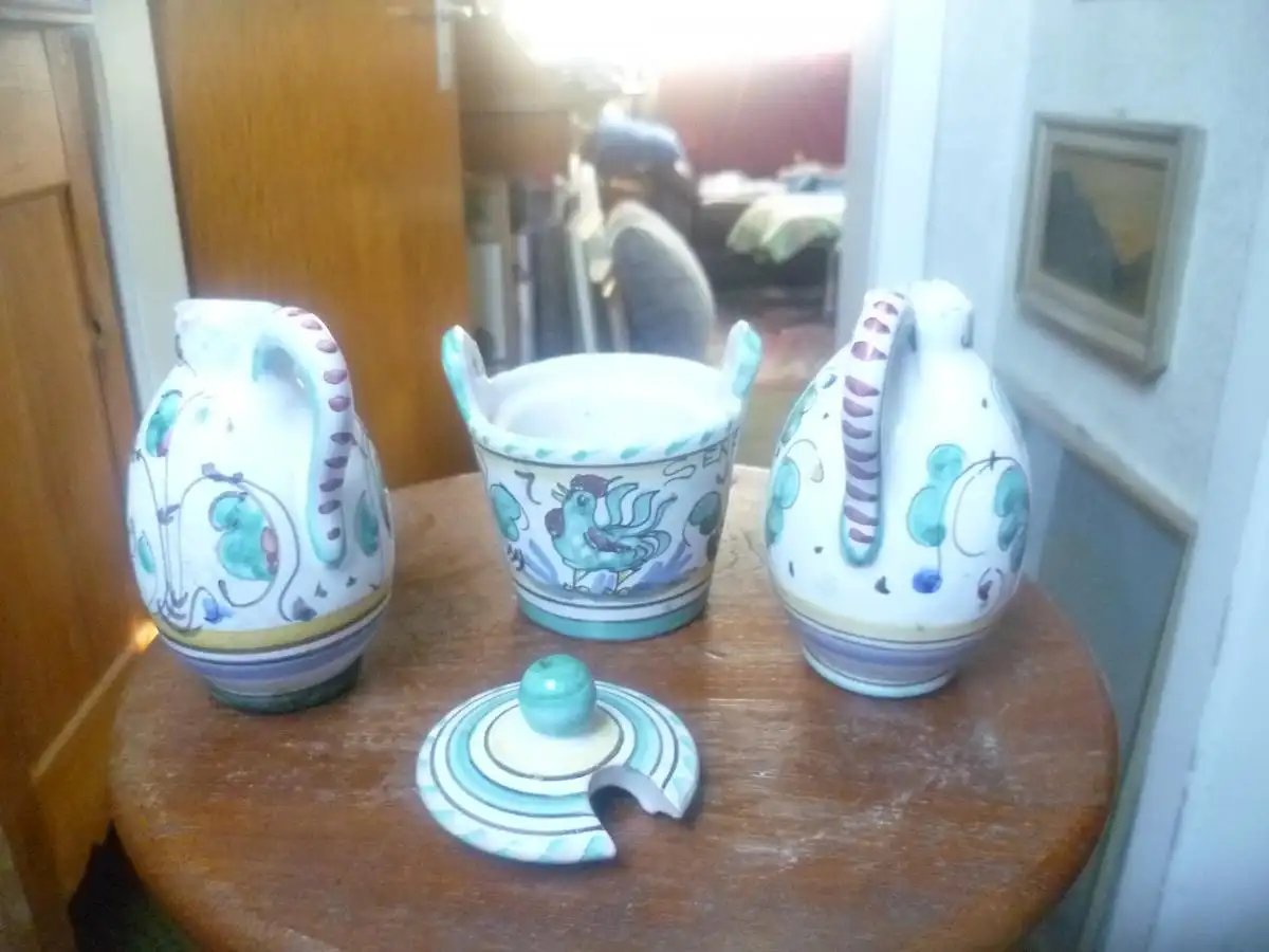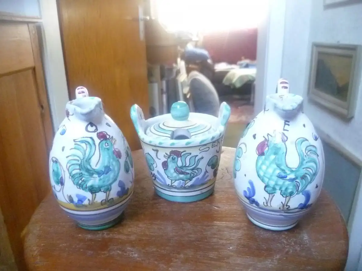Perugia / Deruta Italien Konvolut Essig , Öl und Senf Hand bemalte Keramiken Italien um 1960 signiert F.S aus der Vitrine