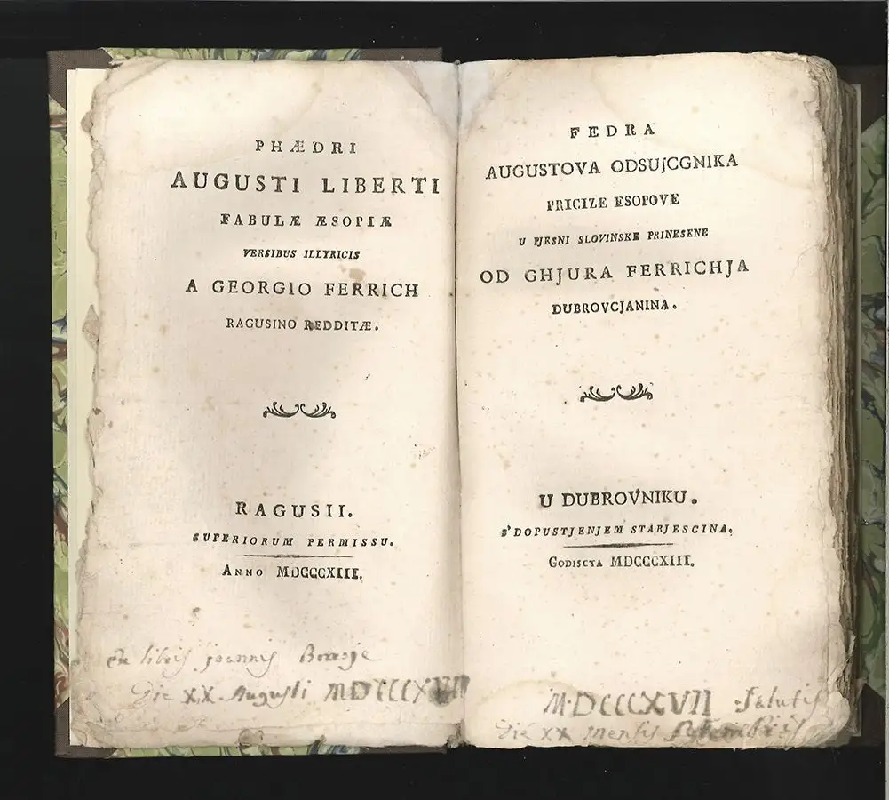 Bemerkungen: Erste und wohl einzige Ausgabe der von Duro Feric (1739-1820) ins Serbokroatische übersetzten Ausgabe der Fabeln des Phaedrus.