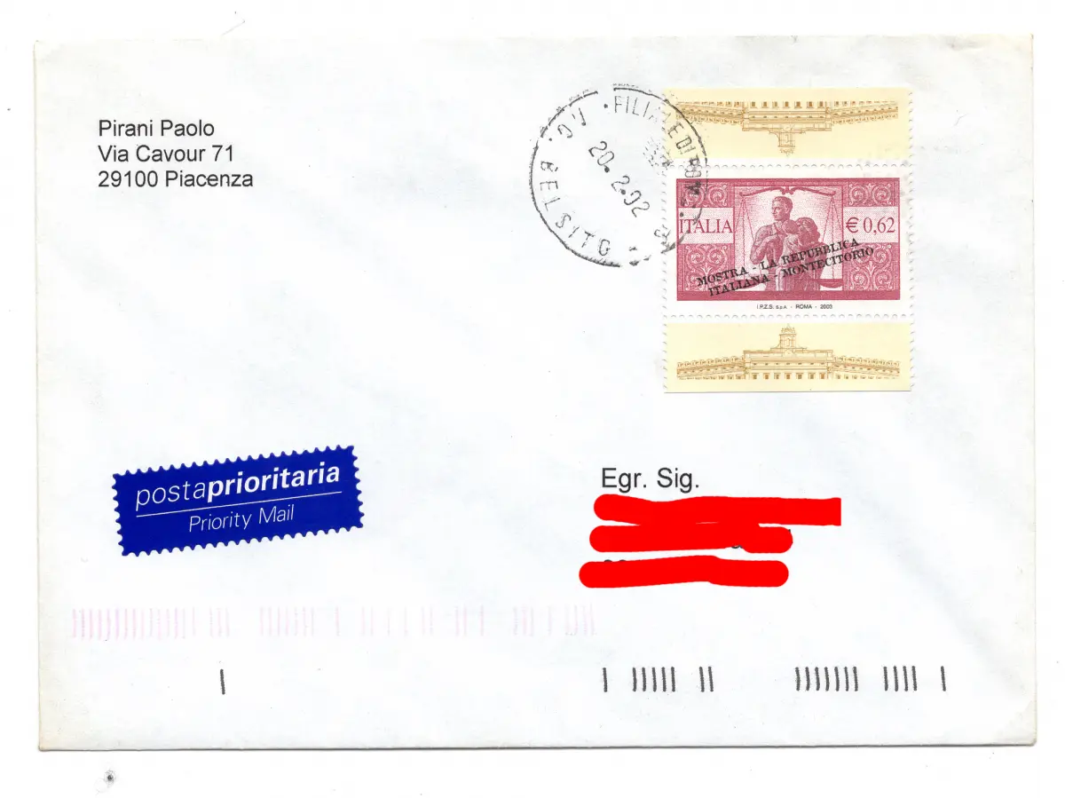 - Philatelistische Ausstellung Montecitorio Nr. 2667/I die Briefmarke aus Carnet isoliert auf Umschlag von Rom nach Stadt am 20.2.2002 (Abfahrtsstornierung ist falsch, Versand am 20.3.2003) - Regel gereiste Umschlag, ohne Ann. bei Ankunft aber mit Barcode unten - Ungewöhnlich (762/19)