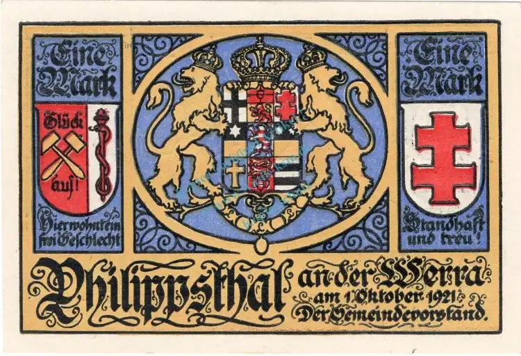Philippsthal , Notgeld 1 Mark Schein Nr.2 unc-kfr. M-G 1058.1 , Hessen 1921 Seriennotgeld