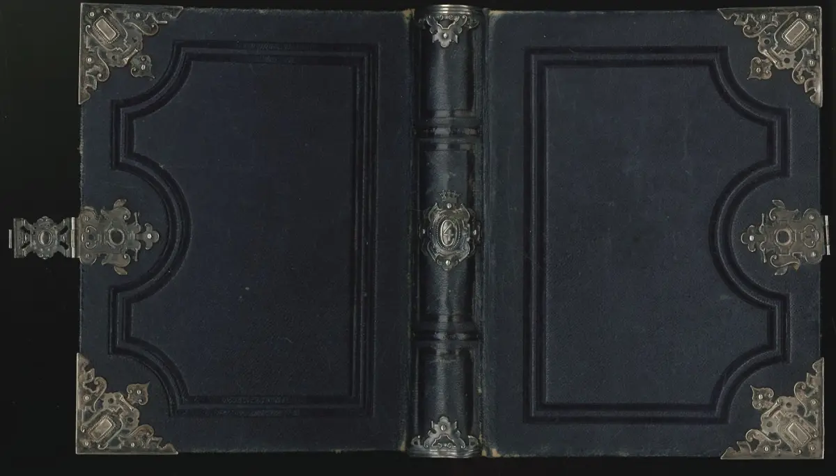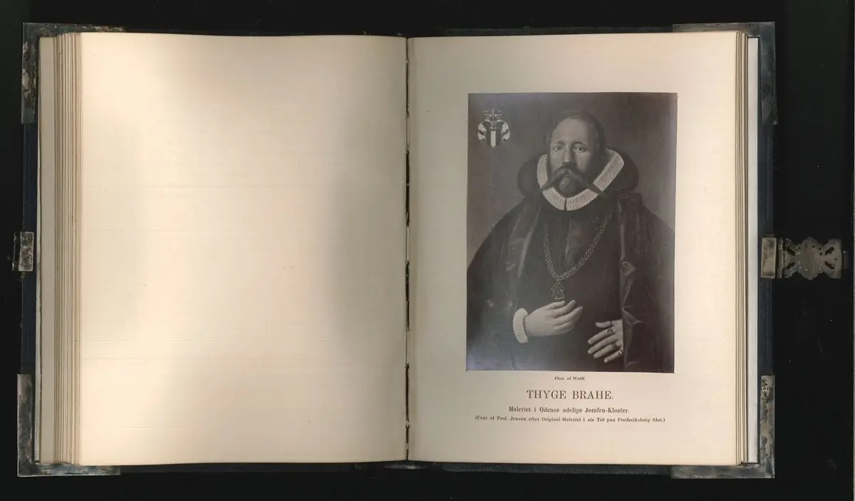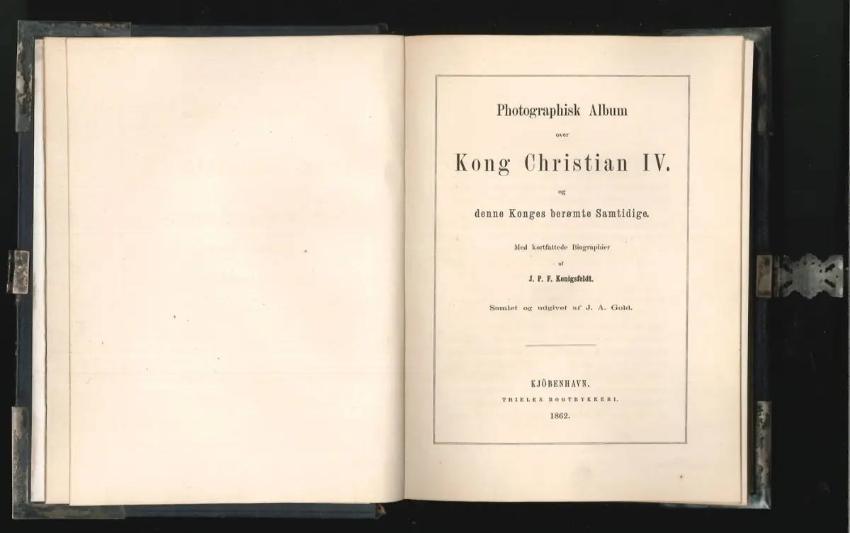 Kopenhagen, Thieles Bogtrykkeri 1862. 8°. Titelbl., 2 Bl., 25 Bll. mit 24 Original-Photographien von Gemäldeportraits. Ldr.-Bd. mit Messingbeschlägen an den Ecken, Kanten, an dem Kapitalen u. am Rücken, mit intakter Messingschließe. Kanten berieben, Buchblock gebrochen, etwas gebräunt. Hint. Spiegel mit Buchbineretikett "Ingebunden hos A. F. Jürs, Pilestraede 44".