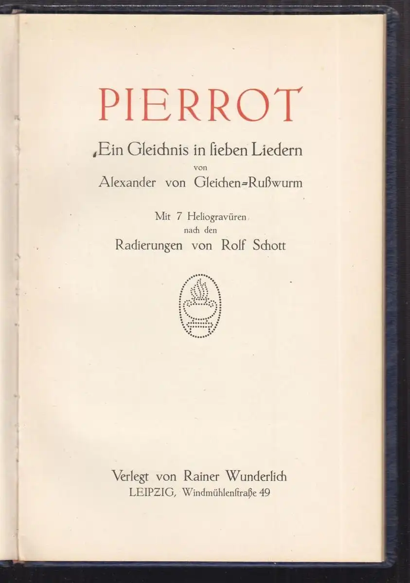 Lpz., Rainer Wunderlich [ca. 1918]. 4. Aufl. gr.-8°. 15 Bll., Mit 7 mont. Heliogravüren nach Radierungen von Rolf Schott. OLdr. Kap. u. Ecken berieb.