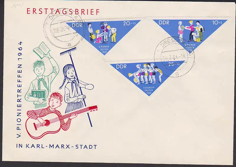 Pioniertreffen 1964 Ost. Dresden 29.7.64 (1045/47) einzige Dreiecksmarken der DDR