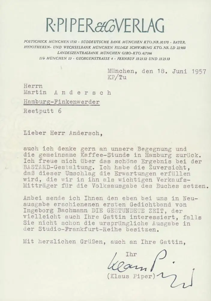 An den Schriftkünstler, Buchgestalter u. späteren Professor für Gestaltung Martin Andersch (1921-1992) in Hamburg-Finkenwerder, der die Neuausgabe des Romans Der Bastard von Brigitte von Tessin gestaltet hatte. "Ich freue mich über das schöne Ergebnis bei der BASTARD-Gestaltung. Ich habe die Zuversicht, daß dieser Umschlag die Erwartungen erfüllen wird, die wir in ihn als wichtigen Verkaufs-Mitträger für die Volksausgabe des Buches setzen." Sendet "den eben bei uns in Neuausgabe erschienenen ersten Gedichtband von Ingeborg Bachmann DIE GESTUNDETE ZEIT, der vielleicht auch Ihre Gattin interessiert..." - Mit 1 Bugfalte