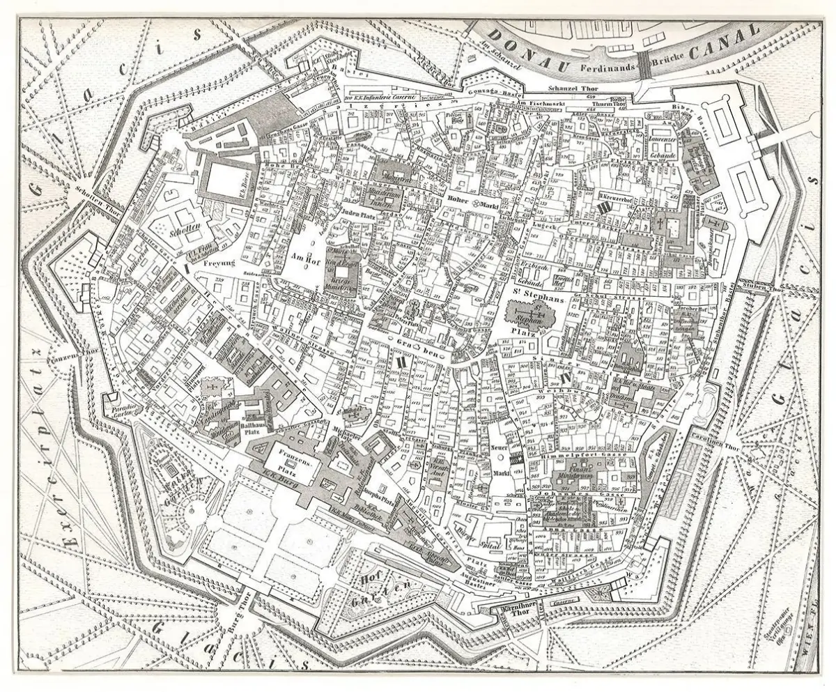 Bemerkungen: Nebehay-Wagner 935, 24 (1856) - Plan der Inneren Stadt (heute: 1. Wiener Gemeindebezirk) mit den alten Stadtmauern. Aus: M. Auer`s "Faust-Poligrafisch-illustrierte Zeitschrift", Wien 1853. Am unteren Rand im Stein signiert u. datiert "1853".