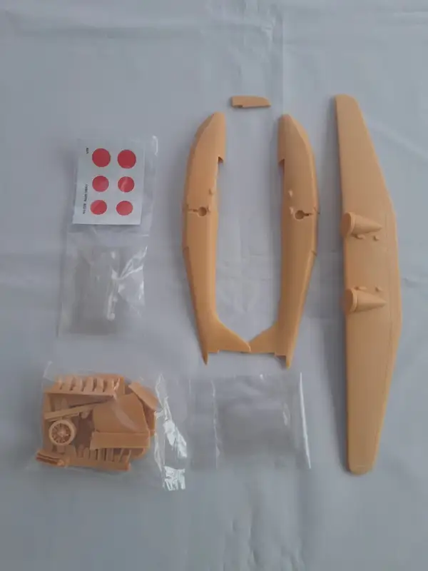 Einzelteile (Plastikbauteile) sind noch am Rahmen fixiert; Sichthüllen wurden geöffnet.