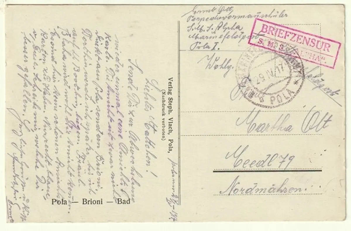 Bemerkungen: Gelaufen m. Stempel: Briefzensur/S.M.S. Alpha. Kastenst. zweizeilig rot - KALIS 6-P.15 neben K.u.K. MFPA/29. IV. 17/Pola. 1883 Raddampfyacht Greif. Hulk-Torpedoschule.