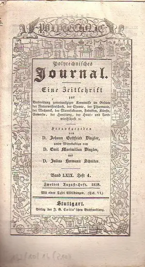 Polytechnisches Journal. Hrsg. v. Johann Gottfried Dingler, Emil Maximilian Dingler und Julius Hermann Schultes: Polytechnisches Journal. Band LXIX. Heft 4, Zweites August=Heft 1838. (= 19. Jahrgang, 16. Heft). Eine Zeitschrift zur Verbreitung gemeinn