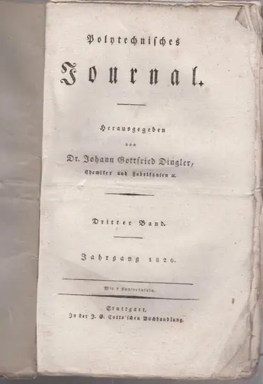 Freie Beschreibung: Gr.-8°. Etwas angestaubte Interimsbroschur mit handschriftl. Bandbez. Die seitl. Ränder nicht beschnitten. Mit einigen Knickstellen. Komplett mit Seiten XII, 385-503. (unaufgeschn. ) Mit einer mehrf. gefalteten Kupfertafel. Gutes Exemplar. -- Siehe Kirchner 3940. - Das umfangreichste deutschsprachige polytechnische Journal des beginnenden Industriezeitalters ist ein unschätzbares Archiv des technischen Fortschritts auf industriellen, wirtschaftlichen, arbeitstechnischen und hauswirthschaftlichen Gebieten