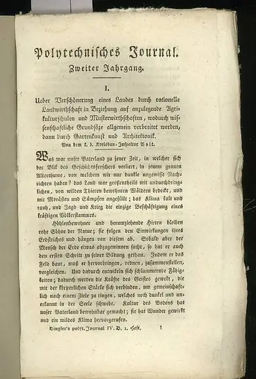 Freie Beschreibung: Gr.-8°. Interimsbroschur mit handschriftl. Bandbez. Die seitl. Ränder nicht beschnitten. Mit einigen Knickstellen. Komplett mit Seiten 1-128 , ohne die Tafel. (teilw. aufgeschn.). Innen gutes Exemplar. -- Siehe Kirchner 3940. - Das umfangreichste deutschsprachige polytechnische Journal des beginnenden Industriezeitalters ist ein unschätzbares Archiv des technischen Fortschritts auf industriellen, wirtschaftlichen, arbeitstechnischen und hauswirthschaftlichen Gebieten
